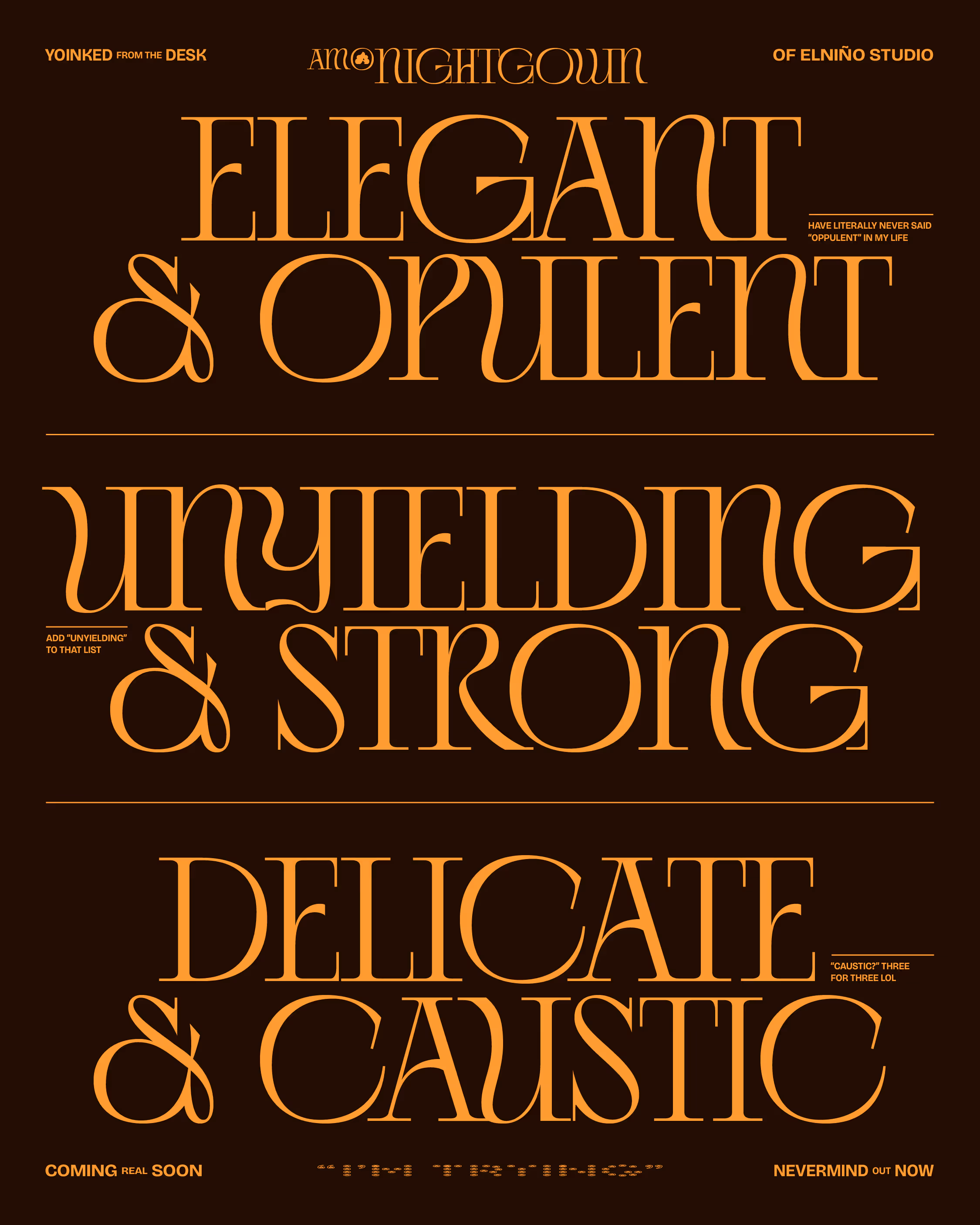 In another world, the name for this font could have been, Pajamas. Could you imagine that? Like, just sitting above this block of text? Anyway, this font came from an unused hospitality concept back in 2023. I can't say for sure, but based on how much I burned the midnight oil back then, I most likely was in my pajamas.
